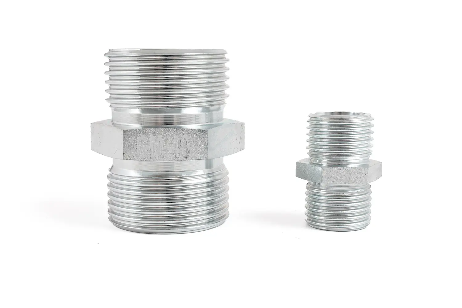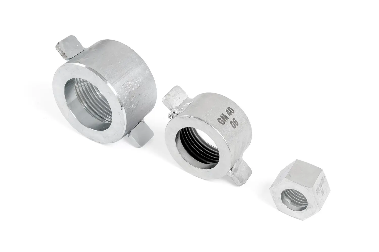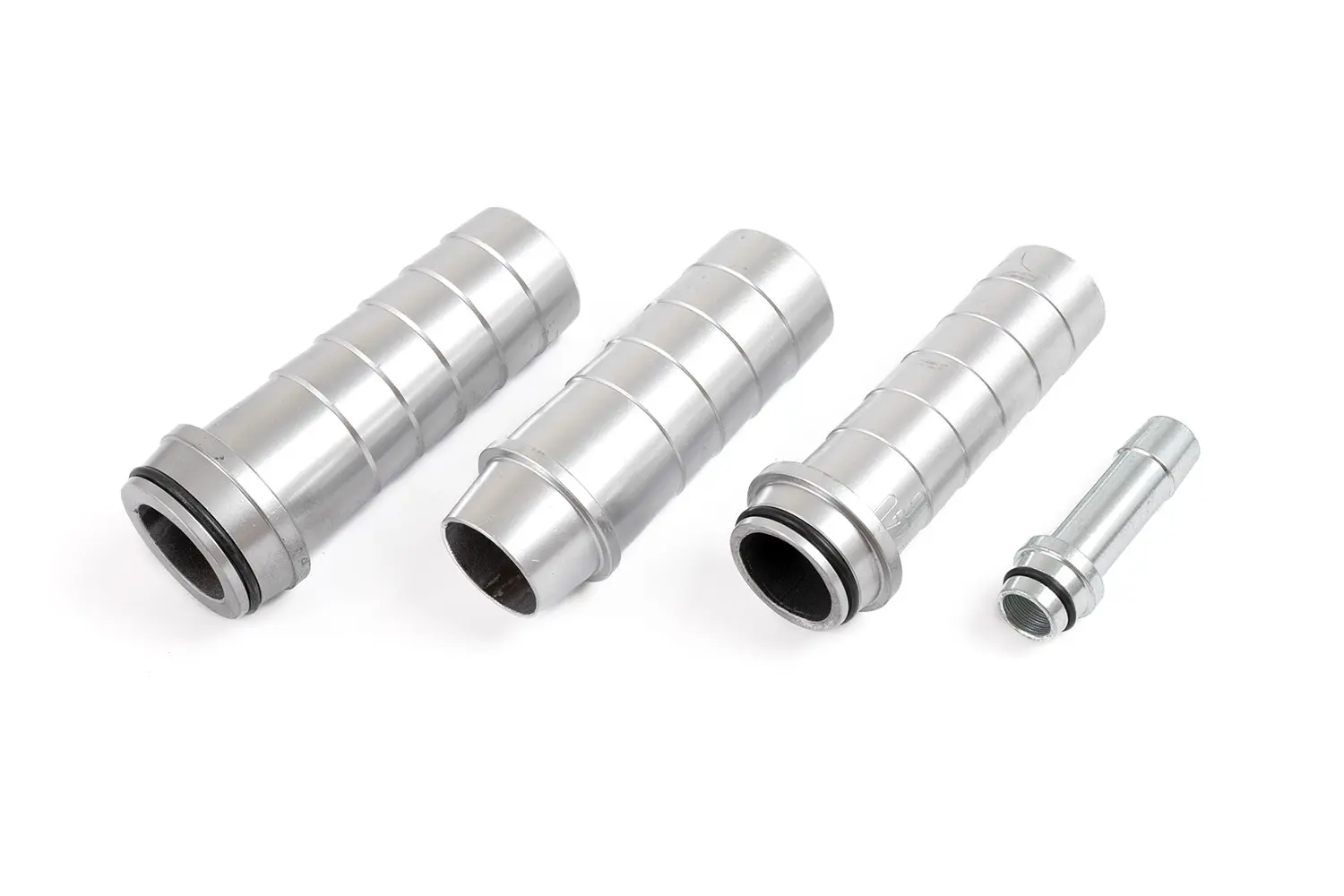 Armatura sprężonego powietrza, elementy pneumatyki sterowniczej: zawory odcinające, końcówki i złączki do węży, nakrętki oraz dwuzłączki.