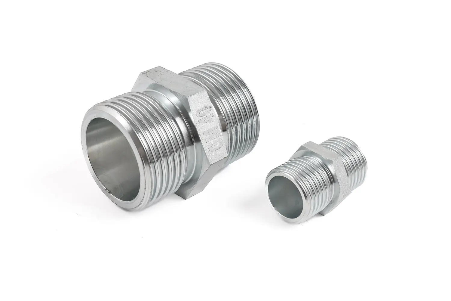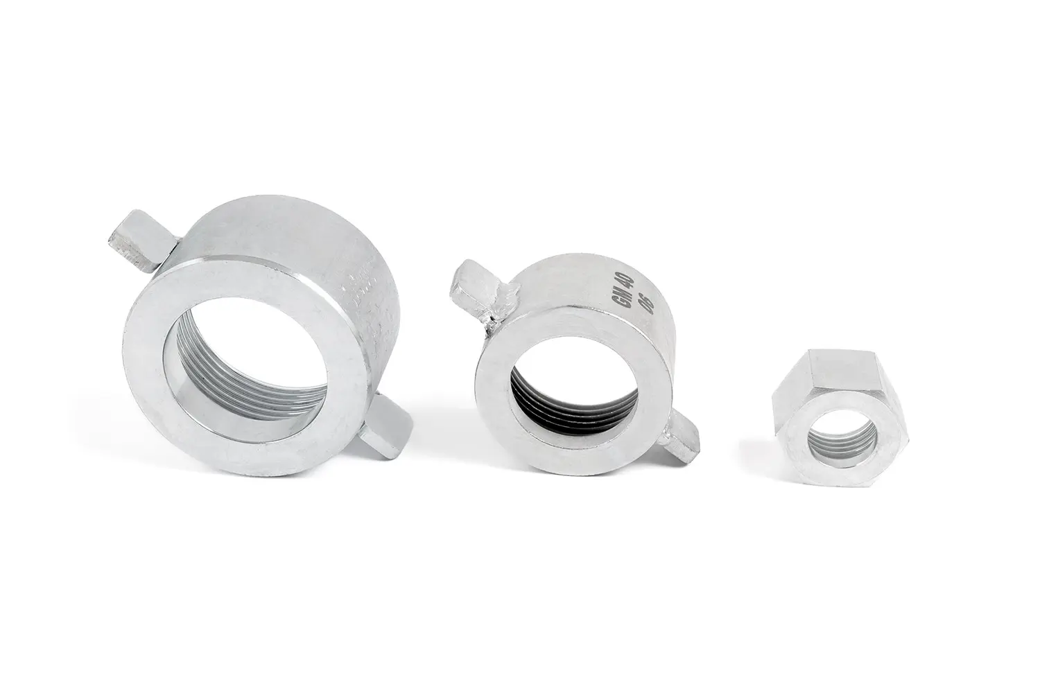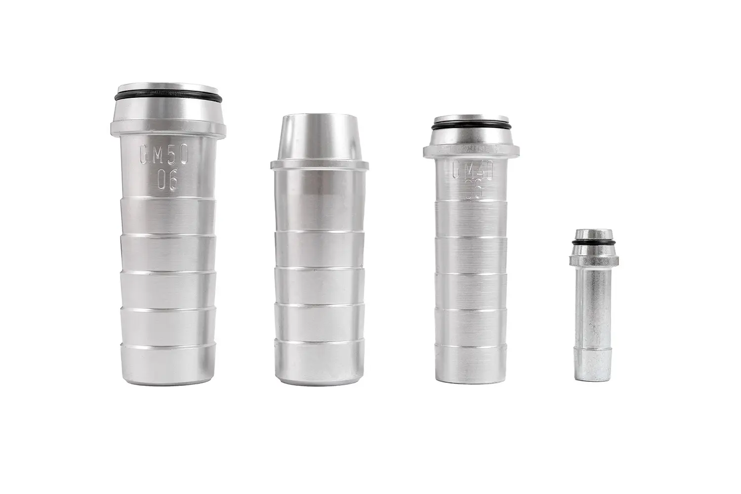 Armatura sprężonego powietrza, elementy pneumatyki sterowniczej: zawory odcinające, końcówki i złączki do węży, nakrętki oraz dwuzłączki.